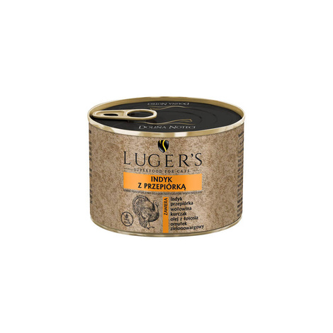 Odpowiednio skomponowane ze sobą gatunki mięs: indyka, wołowiny, kurczaka i przepiórki, stanowią źródło pełnowartościowego białka oraz tłuszczów pochodzenia zwierzęcego. Składniki te znacząco wpływają na podwyższenie atrakcyjności i smakowitości pożywienia dla kota, który jest mięsożercą. Zawarte w białku cenne aminokwasy zapewniają prawidłowy przebieg procesów metabolicznych, nie obciążając tym samym funkcji wątroby i nerek. Tłuszcz, wpływający na wysoką wartość odżywczą tych gatunków mięs, dostarcza niezbędnych kwasów tłuszczowych, zwłaszcza z rodziny n-6 oraz rozpuszczalnych w tłuszczach witamin A i D. Substancje te są niezwykle istotne w utrzymaniu prawidłowego funkcjonowania organizmu kota. Olej z łososia, poprzez obecność cennych kwasów tłuszczowych n-3 oraz EPA i DHA, gwarantuje prawidłową kondycję skóry i sierści, a także sprawia, że kot lepiej radzi sobie z możliwymi objawami reakcji alergicznej. Bezzbożowa karma dla kota mokra Luger’s indyk z przepiórką zawiera dodatek drożdży piwnych, wywierających korzystny wpływ na florę bakteryjną jelit, charakteryzujących się wysoką wartością biologiczną oraz witaminy z grupy B. Nasiona babki płesznik, dzięki zawartości błonnika, wspomagają pracę układu pokarmowego, regulując perystaltykę jelit, a omułek nowozelandzki zielonowargowy stabilizuje funkcje stawów w czasie aktywności fizycznej.