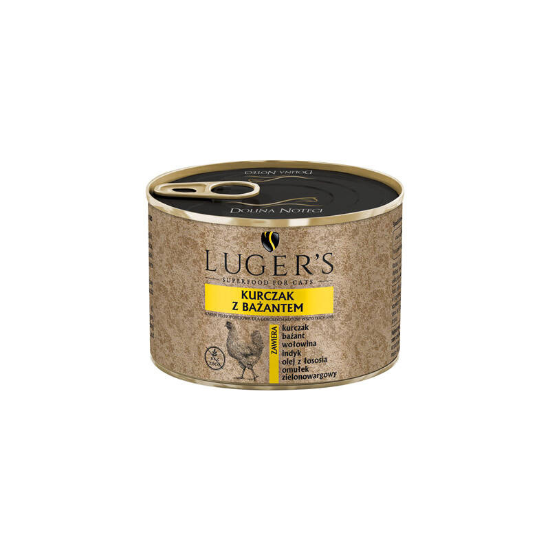 W karmie mokrej Luger’s kurczak z bażantem białka i tłuszczu dostarczają precyzyjnie zestawione ze sobą surowce: kurczak, wołowina, indyk i bażant. Białko tych gatunków mięs zapewnia aminokwasy warunkujące prawidłowy przebieg procesów metabolicznych, eliminując ryzyko nadmiernego obciążenia funkcji wątroby i nerek. Kurczak i bażant są bogatym źródłem aminokwasów siarkowych, które pozytywnie oddziałują na skórę i sierść. Z kolei tłuszcz dostarcza niezbędnych kwasów tłuszczowych, głównie z rodziny n-6 oraz witamin A i D, ważnych w funkcjonowaniu organizmu kota. Dzięki obecności oleju z łososia, a tym samym kwasów tłuszczowych n-3 oraz EPA i DHA, zagwarantowana jest prawidłowa kondycja skóry i okrywy włosowej. Łagodzone są również objawy alergii o różnym podłożu. Karma Luger’s kurczak z bażantem zawiera dodatek drożdży piwnych, które są źródłem dobrze przyswajalnych witamin, zwłaszcza z grupy B, i składników mineralnych. Błonnik, dostarczany przez nasiona babki płesznik, reguluje perystaltykę jelit oraz stabilizuje ilość pożytecznych mikroorganizmów bytujących w przewodzie pokarmowym. Związki występujące w omułku nowozelandzkim zielonowargowym wspierają funkcje stawów w czasie aktywności fizycznej. Dzięki wykorzystaniu surowców uwzględniających specyficzne potrzeby kota, wysokiej zawartość białka i tłuszczu pochodzenia zwierzęcego, karma charakteryzuje się wysokimi walorami smakowymi.