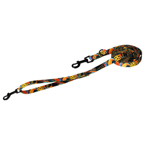 Smycz regulowana dla psa Tropikalna Przygoda to gadżet, dzięki któremu pies będzie się prezentował stylowo na każdym spacerze. Jedynym elementem zdobienia jest naszywka z logiem marki Dolina Noteci. Mocna taśma, wytrzymały karabińczyk, staranne szycie – to wszystko sprawia, że ta designerska smycz ma wyjątkowo solidną konstrukcję, dlatego sprawdza się w każdych warunkach. Zamocowane na smyczy kółka pozwalają na pełną kontrolę nad naszym czworonogiem. Jeżeli stawiasz na najwyższą jakość i niepowtarzalny design w czasie codziennych spacerów - tego produktu nie powinno zabraknąć w Twojej kolekcji. Aby skompletować zestaw wybierz odpowiednią obrożę z serii, która występuje w tej samej gamie kolorystycznej. W tym modelu w łatwy sposób można dostosować długość smyczy według potrzeby. Zadbano o każdy, nawet najmniejszy szczegół. Warte uwagi są przeszycia, które zrobiono grubymi, solidnymi nićmi. Przez taki zabieg wytrzymałość paska jest bardzo wysoka. Dodatkowym atutem jest możliwość utrzymania smyczy w nienagannym stanie, produkt nie wymaga dodatkowych zabiegów pielęgnacyjnych, w razie zabrudzenia można prać mechanicznie w niskich temperaturach.