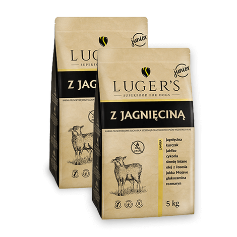 Żywienie szczeniąt i młodych psów powinno bazować na pełnowartościowej karmie, której receptura uwzględnia wszystkie składniki odżywcze niezbędne do utrzymania prawidłowego przebiegu procesów ich wzrostu i rozwoju. Takim produktem jest sucha karma Luger’s. Mięso i produkty pochodzenia zwierzęcego z jagnięciny są źródłem białka o wysokiej jakości biologicznej oraz witamin z grupy B. Prawidłowy stosunek wapnia do fosforu zapewnia bezpieczny wzrost i wydajne funkcjonowanie układu kostnego. Obecność substancji chondroprotekcyjnych: glukozaminy i chondroityny pozytywnie wpływa na stawy, poprawiając ich amortyzację. Do prawidłowej pracy przewodu pokarmowego przyczynia się dodatek wysłodków buraczanych, siemienia lnianego oraz jukki Mojave. Suszona cykoria, jak źródło inuliny, czyli naturalnego prebiotyku, skutecznie optymalizuje florę bakteryjną jelit. Skarbnicą witamin, m.in. A, C, B1, B2 i B3, jest jabłko, które dodatkowo dostarcza przeciwutleniaczy i błonnika pokarmowego. Sucha karma Luger’s to wartościowy i pyszny posiłek dla Twojego szczeniaka.