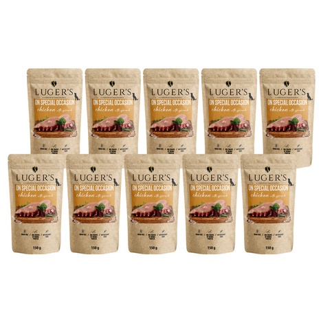 Luger's On Special Occasion kurczak ze szpinakiem to pełnoporcjowy posiłek oparty na jednym źródle białka, idealny dla dorosłych psów wszystkich ras. Zawiera 75% kurczaka, w tym mięso mięśniowe oraz podroby - wątrobę, serca i żołądki, które dostarczają psu niezbędnych białek oraz witamin, takich jak witaminy A i B, wspierające zdrowie skóry, sierści oraz wzroku. Kurczak to lekkostrawne źródło białka, idealne dla psów z wrażliwym układem trawiennym, które potrzebują zbilansowanej diety.