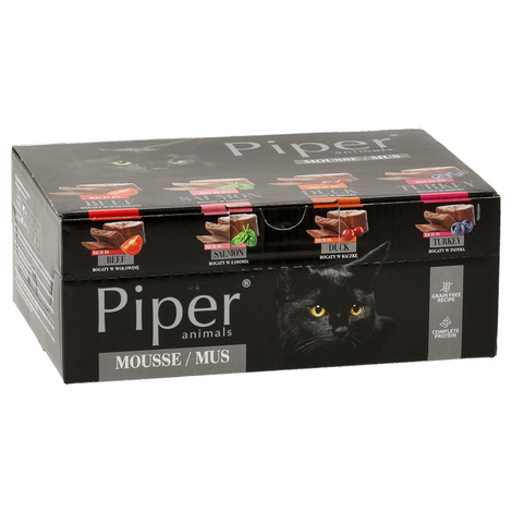 Piper Animals mus to karma pełnoporcjowa dla dorosłych kotów wszystkich ras bogata w indyka. W pełni zaspokaja ich zapotrzebowanie na wszystkie niezbędne składniki odżywcze. Starannie skomponowana receptura zapewnia optymalną ilość wysoko przyswajalnego białka i tłuszczu, niezbędnych dla zdrowia i energii kota. Odpowiednia tekstura karmy podnosi jej smakowitość, a jednocześnie sprzyja lepszej strawności. Dodatek borówek stanowi cenne źródło związków biologicznie czynnych, wspierających prawidłowe funkcjonowanie dróg moczowych i pęcherza. Tauryna została wprowadzona z myślą o kluczowych potrzebach metabolicznych kotów, a kwasy tłuszczowe z grup n-6 i n-3 dostarczają zarówno energii, jak i substancji wspomagających prawidłowy przebieg procesów metabolicznych w organizmie zwierzęcia. Precyzyjnie dobrane proporcje minerałów, ze szczególnym uwzględnieniem optymalnego stosunku wapnia do fosforu, gwarantują prawidłowe współdziałanie układu kostnego i mięśniowego. Dzięki nowoczesnej, mało inwazyjnej technologii produkcji oraz starannie wyselekcjonowanym surowcom karma wyróżnia się lekkostrawnością i wysoką biodostępnością wszystkich składników odżywczych. Idealnie odpowiada wymaganiom żywieniowym dorosłych kotów.