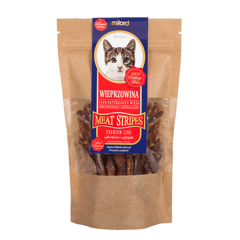 Naturalny przysmak twardy dla kota wieprzowina Warto urozmaicać dietę kota o przekąski, z tego powodu powstał przysmak dla kota z wieprzowiny w postaci pasków marki Milord. Skrupulatnie dobrane, ręcznie krojone mięso wieprzowe jest najmniej alergizującym mięsem, a do produkcji wybrano wyłącznie szynkę i schab. Proces suszenia ciepłym powietrzem w niskiej temperaturze pozwala na zachowanie wszystkich walorów smakowo-zapachowych, bez potrzeby dodawania konserwantów, barwników i wzmacniaczy. Przysmak doskonale nadaje się do przywołania kota, gdyż po otworzeniu opakowania pupil z pewnością poczuje jego wyjątkowo apetyczny zapach.