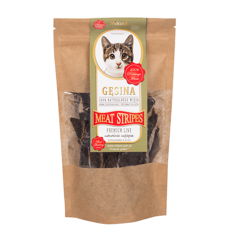 Naturalny przysmak twardy dla kota gęś paski Przysmak dla kota gęś w paskach marki Milord to w 100% naturalne mięso, bez dodatku konserwantów, barwników czy wzmacniaczy smaku i aromatu. Dzięki temu produkt zachowuje wyjątkowy aromat i prawdziwy smak, który pokocha każdy kot. Dzięki wysokiej zawartości białka i odpowiedniej metodzie produkcji - suszenia ciepłym powietrzem w niskiej temperaturze, która pozwala zachować wszystkie wartości odżywcze surowca - przekąski mogą stanowić uzupełnienie codziennej diety. Odpowiednia zawartość włókna surowego i tłuszczu sprawia, że są idealne dla czworonogów mających nadwagę i wrażliwy układ pokarmowy.