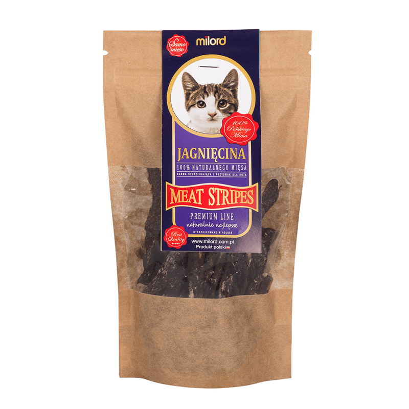 Naturalny przysmak twardy dla kota jagnięcina paski Koty jako bezwzględni mięsożercy potrzebują w swojej codziennej diecie mięsa, właśnie dlatego przysmak dla kota jagnięcina w paskach marki Milord skradł serce niejednemu mruczkowi. Niezwykle prosta receptura, na którą składa się wyłącznie mięso jagnięce, nie zawiera dodatkowych wypełniaczy, konserwantów, barwników ani wzmacniaczy smaku i aromatu. Dzięki temu pupil czuje tylko naturalny smak i aromat przekąski. Wyjątkowy proces produkcji - suszenia ciepłym powietrzem w niskiej temperaturze - sprawia, że w paseczkach zachowane są wszystkie wartości odżywcze mięsa. Ten produkt to doskonały wybór dla kotów z alergią i wrażliwym układem pokarmowym.