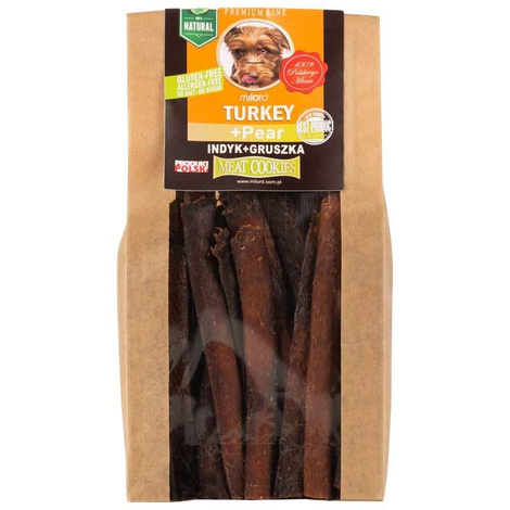Naturalny przysmak z indyka i gruszki to propozycja dla czworonogów lubiących zdrowe i smaczne przekąski. W swoim składzie zawiera wyłącznie mięso oraz owocowy dodatek. Ciastka powstały w procesie suszenia, dzięki temu są kruche, a w ich składzie nie ma mąki.