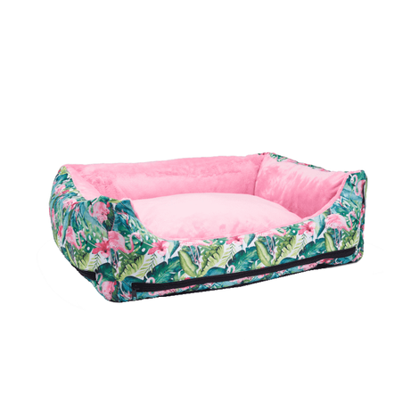 Boki oraz spód legowiska wykonano z miękkiego, stabilnego, wytrzymałego i wzorzystego materiału.