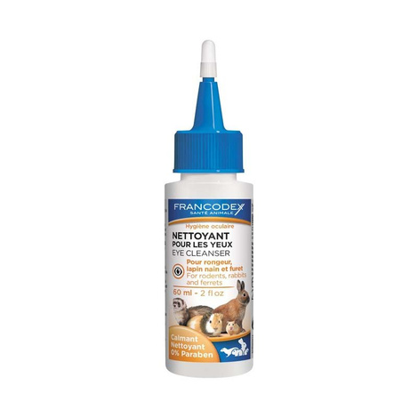 Płyn do czyszczenia oczu dla gryzoni - łagodzi i czyści. Zastosowanie: problemy z oczami są powszechne u gryzoni, ale można im zapobiegać. By to osiągnąć należy regularnie czyścić kontur oczu, powiekę, a także otwór kanału łzowego, który może być zatkany przez wydzielinę łzową. Zanieczyszczenie, kurz, przeciąg powietrza… te czynniki mogą również prowadzić do zapalenia błony śluzowej oka. Właściwości: płyn do czyszczenia oczu dla gryzoni FRANCODEX jest przeznaczony do regularnego czyszczenia konturu oka i powiek, ponieważ eliminuje ciała obce znajdujące się w oku oraz łagodzi podrażnienia. Sposób użycia: Zastosowanie zewnętrzne. Nie połykać. Aplikować dużą ilość płynu do czyszczenia oczu dla gryzoni FRANCODEX wokół oczu i na powiece, delikatnie naciskając na opakowanie. Nadmiar płynu należy wytrzeć za pomocą kompresu, unikając rozcierania. Kontur oczu czyścić od wewnętrznej do zewnętrznej strony, by uniknąć przeniesienia się brudu do kanału łzowego. Czynność powtarzać profilaktycznie 1 raz w tygodniu Kwas salicylowy, wyciąg z oczaru, wyciąg z borówki, woda oczyszczona, substancje pomocnicze
