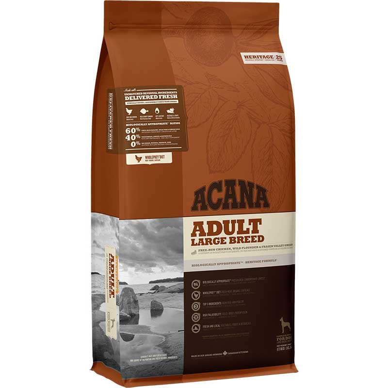 Jedzenie ACANA HERITAGE Adult Large Breed przepełnione jest mięsem kurczaka z wolnego wybiegu, flądrą poławianą w naturalnym środowisku oraz całymi jajami ściółkowymi, które dostarczane są codziennie świeże lub surowe w proporcjach diety WholePrey™ z lokalnych farm preriowych. Jedzenie ACANA HERITAGE nie zawiera zbóż, cechuje się wysoką zawartością białka zwierzęcego i kwasów Omega-3, które gwarantują szczytową formę Twojego psa.