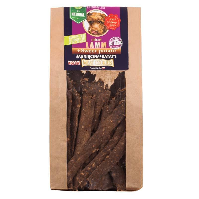 Bezglutenowe ciastka dla psa marki Milord z jagnięciną i batatem to doskonałe źródło łatwostrawnego białka. Mięso jagnięce stanowi aż 75% składu, pozostałe 25% to batat, który jest bogaty w witaminy. Takie połączenie sprawia, że przekąska jest wyjątkowo smaczna, a jej zapach przyjemny. Doskonale sprawdzi się jako nagroda podczas treningów lub zabaw. Ręcznie robione paseczki poddawane są procesowi suszenia ciepłym powietrzem, dzięki czemu produkt nie traci swoich wartości odżywczych.