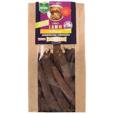 Przysmak dla psa, który powstał w procesie suszenia mięsa jagnięcego i gruszki. Odpowiednio dobrane proporcje 75% mięsa i 25% gruszki wpływają na wyjątkową smakowitość produktu. Ciastka Milord Meat Cookies zachowują swoje walory smakowo-zapachowe, bez potrzeby dodawania do nich konserwantów, barwników i wzmacniaczy, są bezpieczne nawet dla czworonogów z alergiami, a białko w nich zawarte jest łatwo przyswajalne