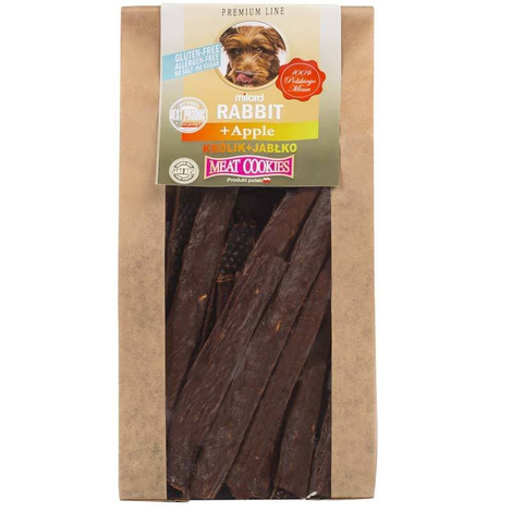 Przysmak dla psa Milord królik z jabłkiem zawiera aż 75% mięsa. Bogaty w białko produkt wzbogacony został o jabłko, które stanowi pozostałe 25% receptury. Dzięki temu przysmak zawiera przeciwutleniacze, które zapobiegają nowotworom, opóźniają starzenie, regulują pracę nerek, ciśnienie i trawienie. Ponadto są one źródłem potasu, wapnia, żelaza, fosforu i witamin z grupy B,C i PP. Błonnik zawarty w dodanym do smakołyka jabłku wspiera procesy trawienne i usprawnia metabolizm. Przysmaki Milord są wyjątkowo kruche i aromatyczne. Nie zawierają konserwantów, barwników ani polepszaczy smaku. Ze względu na brak glutenu mogą spożywać go również psi alergicy.