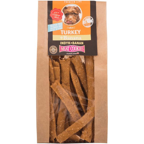 Kruche ciastka dla psa, składające się w 100% z naturalnych składników. Powstają one w procesie suszenia mięsa z indyka i banana w proporcjach 75% mięsa i 25% owocu. Ciastka Milord Meat Cookies zachowują swoje walory smakowo-zapachowe, bez potrzeby dodawania do nich konserwantów, barwników i wzmacniaczy, są bezpieczne nawet dla czworonogów z alergiami, a białko w nich zawarte jest łatwo przyswajalne.