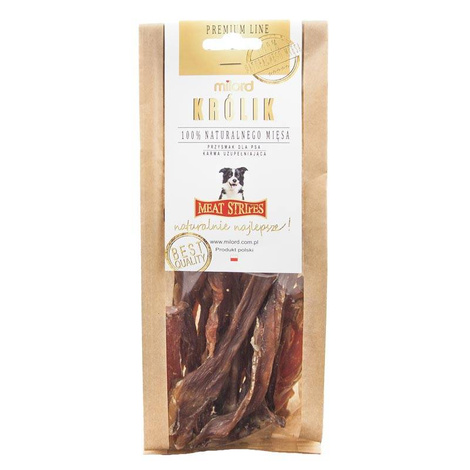 Skrupulatnie dobrane, ręcznie krojone mięso królicze w formie pasków. Przysmaki są podzielne, idealne do treningów, świetne jako przekąska oraz do nagradzania. Doskonałe dla psów każdej wielkości. Znajdują zastosowanie jako karma uzupełniająca. Królik jest bezpiecznym wyborem niemal dla każdego psa, ponieważ jego mięso jest obok wieprzowiny najmniej alergizującym mięsem. Przysmaki produkowane są wyłącznie z mięsa z całych tuszek króliczych. Produkowane w Polsce pod nadzorem inspekcji weterynaryjnej - MILORD WNI 24168301. Przysmaki suszone są ciepłym powietrzem w niskich temperaturach. Proces suszenia zapewnia całkowite bezpieczeństwo epidemiologiczne, bez użycia środków konserwujących. Przysmak nie zawiera: gliceryny, konserwantów, wzmacniaczy smaku i aromatu, wypełniaczy.