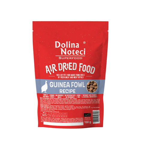 Karma Dolina Noteci SUPERFOOD danie z perliczki jest pełnoporcjową, bytową karmą przeznaczoną dla dorosłych psów. Mięso i produkty pochodzące z perliczki stanowią doskonałe źródło łatwostrawnego białka o wysokiej jakości odżywczej oraz tłuszczu bogatego w kwasy tłuszczowe z rodziny n-6. Wysoka zawartość tego surowca w karmie pozytywnie wpływa na żywienie psów z delikatnym przewodem pokarmowym oraz rozbudowanej okrywie włosowej. Wołowina i indyk idealnie komponują się z perliczką zapewniając całemu daniu wysoką wartość odżywczą oraz smakowitość. Świeże warzywa i owoce, oprócz bogactwa substancji biologicznie czynnych, stanowią ważny element diety psa zapewniając mu prawidłowe funkcjonowanie. Dodatek nasion babki płesznik, jukki Mojave, siemienia lnianego oraz surowców będących źródłem prebiotyków: mannanooligosacharydów, β-glukanów i inuliny, gwarantują prawidłowe działanie układu odpornościowego oraz procesy trawienia dorosłego psa. Na produkcie może występować biały nalot, który jest efektem naturalnie zachodzącej krystalizacji składników mięsa. Nie ma on wpływu na jakość karmy.