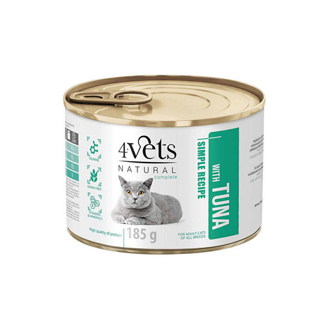 Jest idealnym wsparciem żywieniowym zwierząt zdrowych, jak i po okresie żywienia dietetycznego. Dzięki wykorzystaniu różnych rodzajów mięs i podrobów z wołowiny, wieprzowiny i tuńczyka, karma 4Vets Natural z tuńczykiem stanowi idealne źródło białka i tłuszczu. Niezbędny dodatek składników witaminowych, mineralnych i tauryny zapewnia prawidłowy przebieg wszystkich procesów metabolicznych. Karma jest produktem o wysokiej jakości i wartości odżywczej, zawierającym optymalną ilość tłuszczu naturalnie występującego w mięsie i produktach pochodzenia zwierzęcego. W jej skład wchodzi tuńczyk, który jest naturalnym źródłem niezbędnych kwasów tłuszczowych oraz kwasów z rodziny n-3. Dodatek tauryny pokrywa jej dzienne zapotrzebowanie, dzięki czemu trawienie tłuszczu i białek przebiega prawidłowo. Właściwy stosunek wapnia do fosforu przyczynia się do utrzymania homeostazy, czyli równowagi w organizmie tych pierwiastków oraz zapewnienia mineralizacji kości na stałym poziomie. Skład karmy oraz zastosowana metoda produkcji powodują, że karmy 4Vets idealnie sprawdzą się w codziennej diecie zdrowego kota, jak i tego, który powraca do zdrowia po przebytej chorobie.